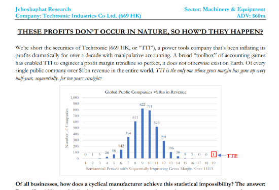 有报道称,沽空机构Jehoshaphat Research发表报告指,目前正在沽空创科实业,表示创科是全球所有收入超过10亿美元的上市公司中,唯一一家连续十年毛利率呈每半年度持续上升的公司,指控公司过去十多年来是通过会计技巧来大幅夸大利润,包括将价值数十亿美元的日常开支拨入各种资产账户中,令财务报表中部分成本被隐藏或推移到数年后。